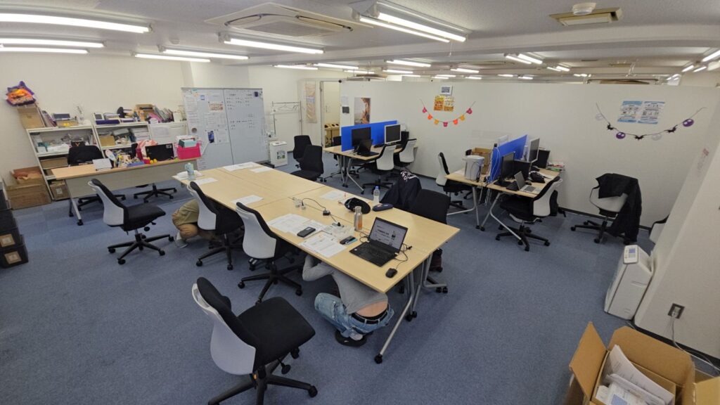 作業中に大きな揺れ(震度 5 強程度を想定)が発生。YouTube の地震訓練用音源を利用し、テーブルの下に入り身を守る訓練です。皆さん真剣な表情で訓練に参加していただきました。